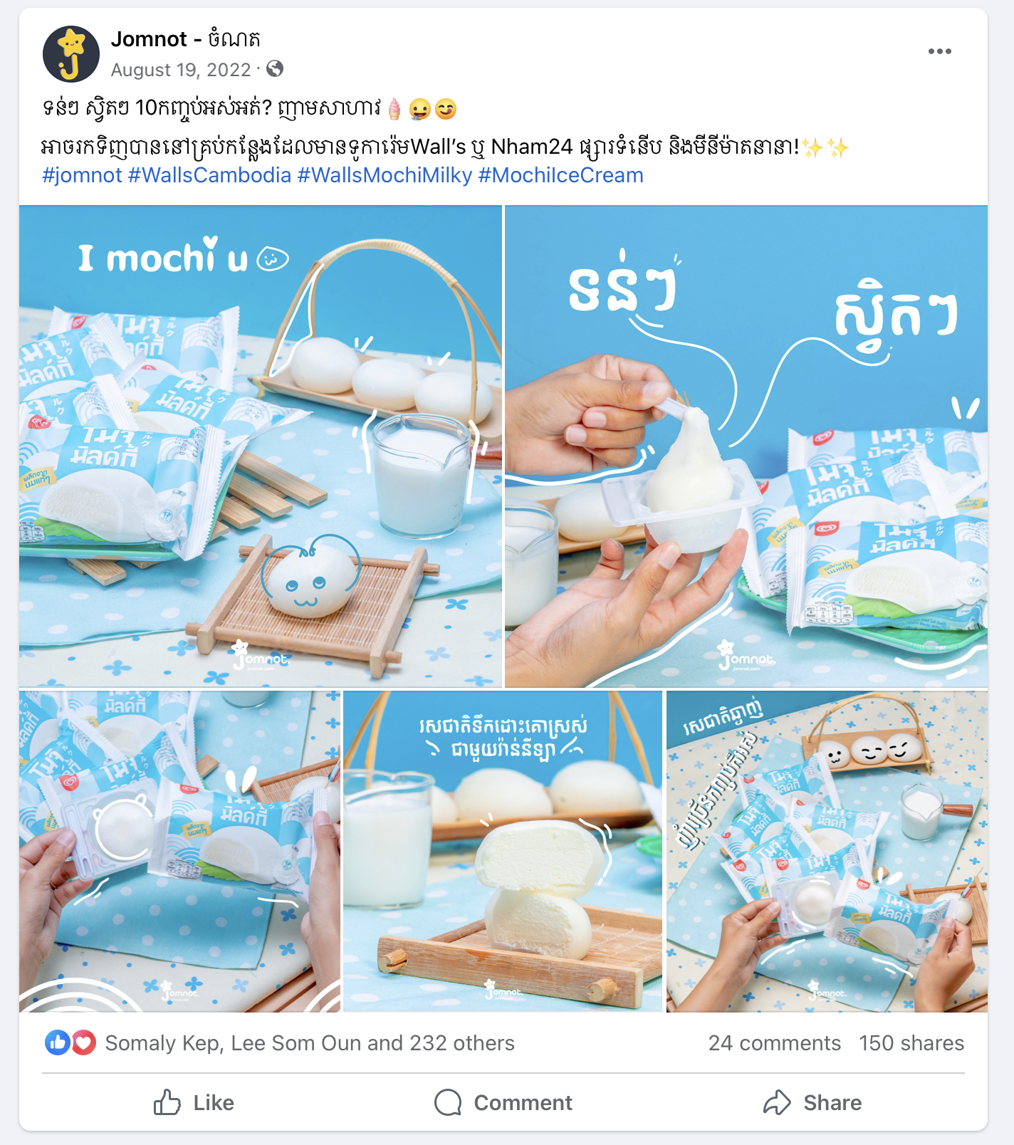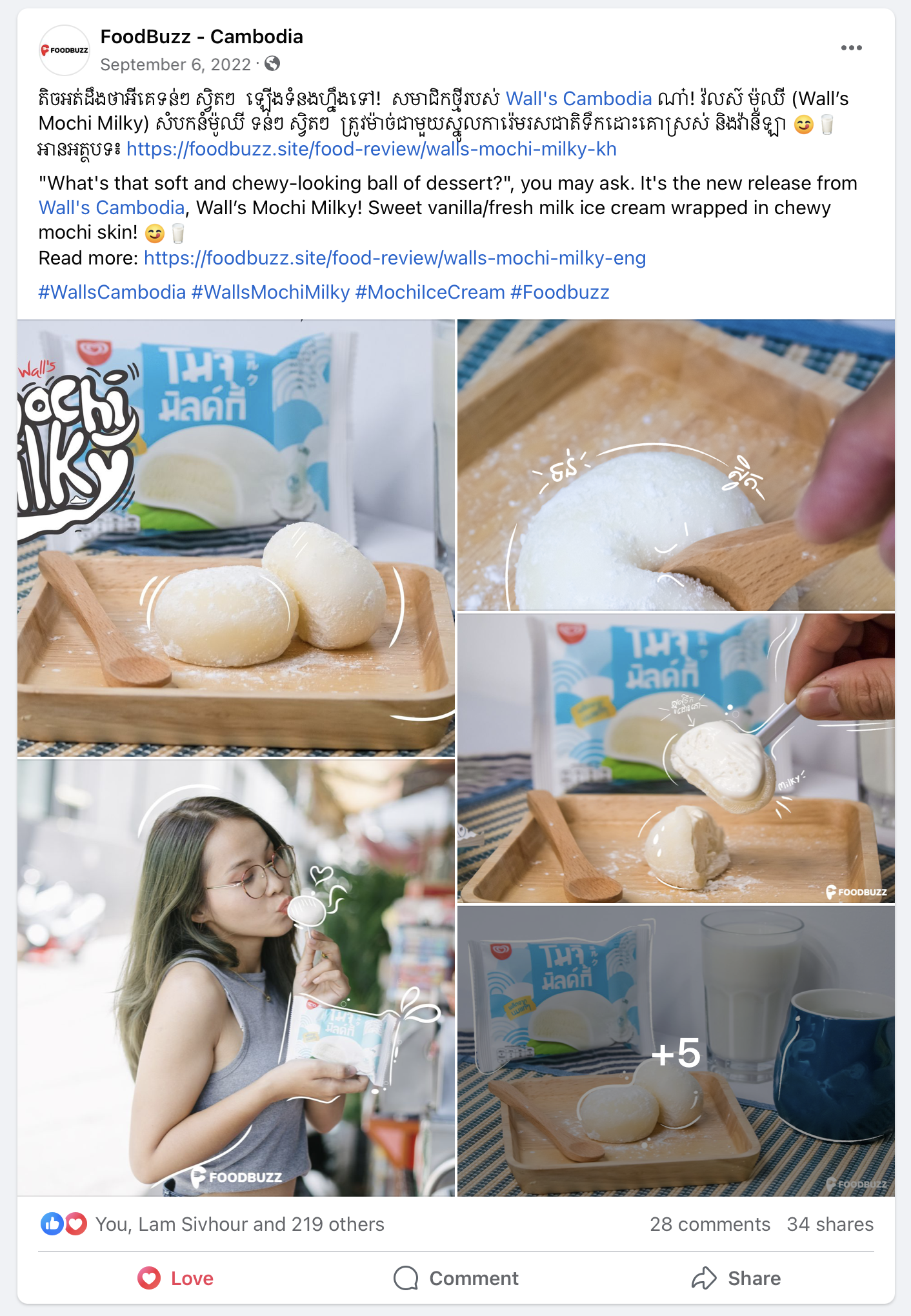 By leveraging hashtags like #WallsCambodia #WallsMochiMilky, We also teamed up with content creators to create a buzz among our target audience. I also played a role in providing creative concept to better align with the campaign's essence including the song and dance move sample. That also includes providing art direction of the product photo albums from the cross-posting pages.